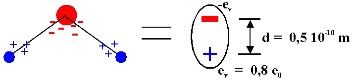 Molekula vode H2O je sicer nevtralna, ampak je več negativnega naboja zbrano ob atomu kisika, zato je tam bolj negativno nabita, ob atomih vodika pa pozitivno nabita. Težišči pozitivnega in negativnega naboja, ki znaša približno ev = 0,8 osnovnega naboja, sta v molekuli vode narazen za približno d = 0,5. 10-10 m. Zato se molekula vode ob pozitivno naelektrnemu balonu obrne tako, da je negativni del bliže balonu, pozitivni pa proč od balona. Ker je negativni naboj bliže balonu, deluje nanj večja privlačna sila, kot je odbojna sila med balonom in pozitivno nabitim delom molekule vode. Razlika teh dveh sil je sila, ki smo je prej izračunali in ukloni curek od navpične smeri.