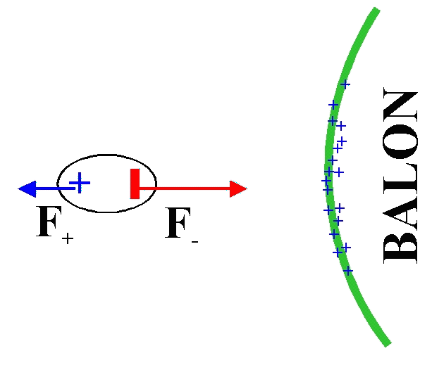 Od kod sila v prečni smeri, ko curku približamo balon? Na balon smo z drgnjenjem dovedli ali odvedli (odvisno od snovi ob katero ga drgnemo) negativni naboj - elektrone. Vzemimo, da balon naelektrimo pozitivno - elektrone spravimo z balona na pulover.