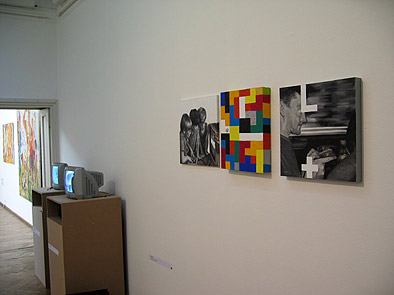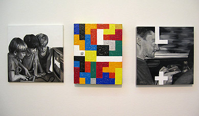 Sašo Vrabič is basically occupied with the image-generating mechanisms of our contemporary society; he recycles images from the mass media and places them into other contexts and relations. The Tetris Triptich is a traditional oil-canvas painting inspired by media images and an abstract close-up of the game itself. In the Triptich he cites playfully but also forebodingly the story of one of the world’s best known computer games whose birth has a strong link to the history of technology – to industrial theft during the cold-war period. Alenka Gregorič summarizes rather insightfully: “His focus is on re-interpreting the response of an individual towards life in contemporary society, which is saturated with new technologies.”