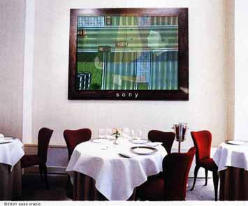in več svetov, saj se realizem interiera restavracije meša z virtualno