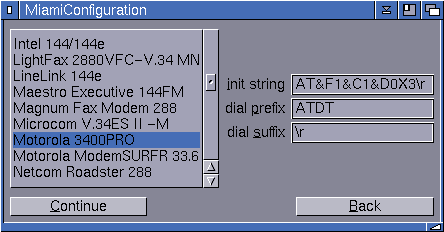 Z izbiro modema MiamiInit sam ugotovi potrebne nastavitve za uporabo. Na konec init string bo potrebno dodati ukaz X3. Če vas telefonski priključek omogoča tonsko izbiro vpišete ATDT v polje dial prefix, sicer vpišete ATDP. MiamiInit resetira in preveri modem.