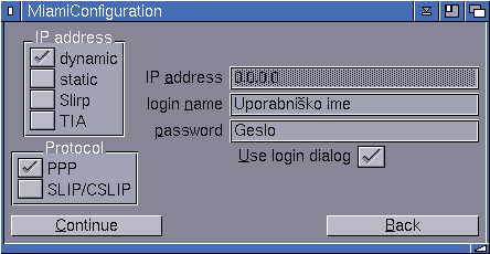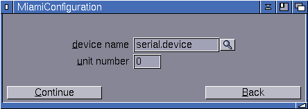 Izberemo ime in stevilko serijskega gonilnika. Običajno je to serial.device in 0, če uporabljate mrežno ali I/O karto izberete npr. a2065.device, a2322.device, gvpserial.device... Nadaljujemo s Continue.
