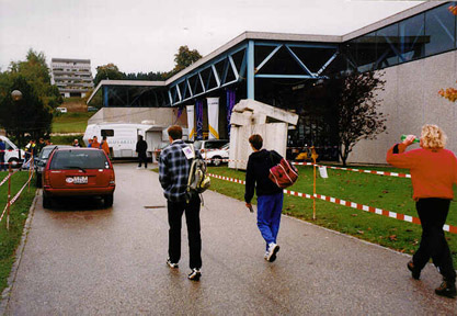 Famous swiss architecture is dominating this parking lot. Entering the hall is for the braves only and it seems that sir Alco has a lot of fans. The red Vulvo is not Fishers. Maybe it's not Vulvo, but we like Vulvo a lot. There is also some Slodisson's artwork. The pissed on corner is not on a pic. |