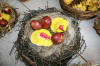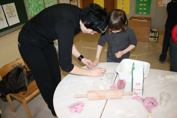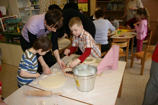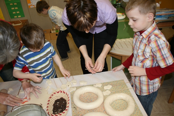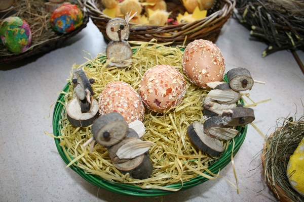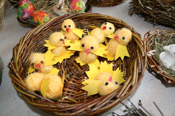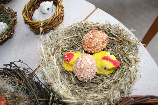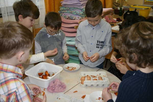 Veliko idej imamo, veliko ustvarjamo, ugotavljamo in poizkušamo. Tudi Velikonočne praznike smo želeli obeležiti. Kako? Tako, da smo skupaj z vsemi člani družine, ki so želeli priti oz.,ki so lahko prišli, ustvarjali aranžmaje z naravnih materialov. Gnetli smo testo in oblikovali piščančke s testa, venčke s testa. Prav tako smo iz lesenih kolobarjev izdelali piščančke. Piščančki so nastajali tudi iz volne. Za oblikovanje jajčk smo uporabili prtičke, ki smo jih nalepili na jajčke, potem večjih jajčnih lupin in zdrobljenih lupin, prav tako najbolj ustaljenega načina barvanja, to je s čebulnimi listi.