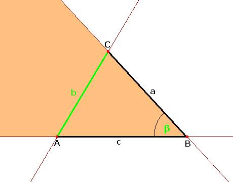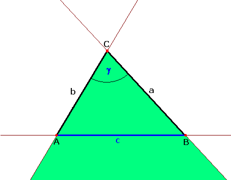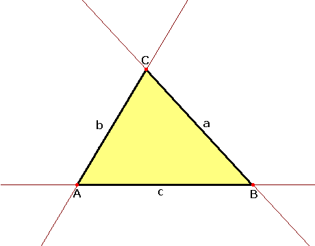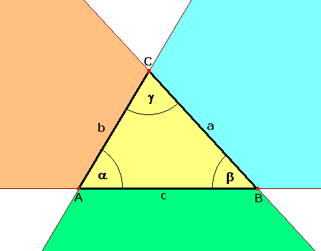 Kote med stranicami trikotnika imenujemo notranji koti trikotnika. Notranje kote označujemo z grškimi črkami: α, β, γ. Kot α ima vrh v oglišču A. Kot β ima vrh v oglišču B. Kot γ ima vrh v oglišču C. Trikotnik je kot del ravnine presek notranjih kotov. Sokote notranjih kotov imenujemo zunanji koti trikotnika. Zunanje kote označujemo z grškimi črkami: α', β', γ'. |