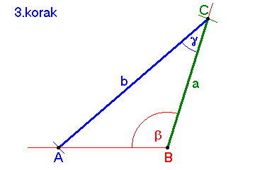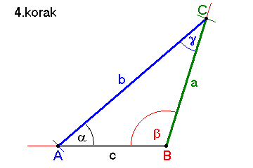 4. korak narišemo in označimo stranico AB označimo preostala dva kota γ in α