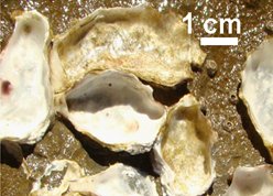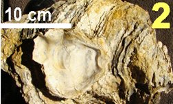 Levo je na veliko fosilno ostrigo pritrjena manjša lupina ostrige iz miocena, iz Panonskega morja. Desno na sliki pa so na flišni peščenjak pritrjene lupine dandanašnjih ostrig iz Jadranskega morja - Debeli rtič.