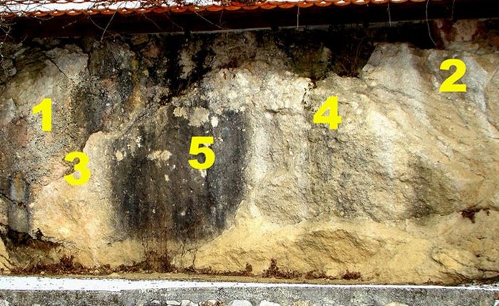 V miocenu (pred 13 m. l.) so strmo kamnito obalo, katero so gradili apnenci jurske starosti (nastali pred 110 m. l.), poseljevale številne kamnovrtne školjke iz rodu Lithophaga, med tem ko so se na ravnem dnu plitvega morja kopičili peščeni sedimenti z ostrorobnimi odlomki kamnin. Luknje, ki so ostale kot dokaz delovanja kamnovrtnih školjk, so približno enako globoke, v nobeni pa ni ohranjena školjčna lupina, kar pomeni, da so bile naknadno raztopljene. V večji množini so ohranjene tudi fosilne školjčne lupine ostrig. So različno dobro ohranjene in velike do 10 centimetrov. Redke so še v življenjskem položaju pritrjene na apnenčevo steno, večinoma pa so razlomljene in se nahajajo v drobnozrnati breči s peščenim vezivom.