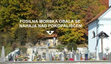 FOSILNA MORSKA OBALA Na strmih skalah je viden stik med sivimi jurskimi apnenci, starimi okoli 180 milijonov let in rumenkastimi peščenimi miocenskimi apnenci, ki so stari 22 milijonov let. Ta stik predstavlja nekdanjo morsko obalo, kjer je terciarno miocensko morje preplavilo širši prostor današnje Slovenije. V jurski apnenec so ob obali kamnovrtne školjke rodu Lithophaga izvrtale okrogle luknje. Podobne primere najdemo še danes na več mestih ob obali jadranskega morja. Tanke lupine kamnovrtnih školjk je po njihovem odmrtju iz lukenj izprala voda, prazne luknje pa je zapolnila terarosa in apnenčevo blato, ki je kasneje otrdelo v apnenec. Ob morski obali pa so uspevale tudi školjke iz skupine ostrig, ki jih danes vidimo, bolj ali manj dobro ohranjene, v rumenkastem miocenskem apnencu. Ko so bile apnenčeve plasti v geološki sedanjosti zopet dvignjene na površino, so vode ob preperevanju izprale apnenčevo snov iz okroglih lukenj, ki so nam zanesljiv dokaz za 22 milijonov let staro morsko obalo.