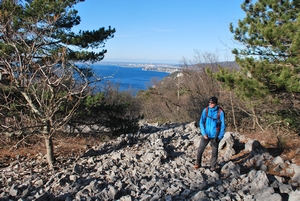 kamnitem krasu, nekaj časa po travnati poti med borovci in hrasti z razgledi na
