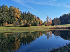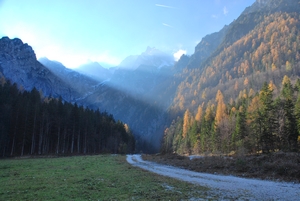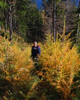 odsevajo jesenske barve macesnov. Peljeva se nazaj v Kotlje. Parkirava v vasi in