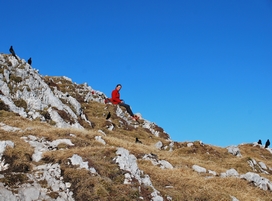 Peci nadaljujeva po markirani poti, vzpneva se čez travnik in na križišču