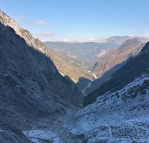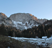 izberem lažjo pot. Kmalu prideva med ruševje, pot je strma, deloma zasnežena.