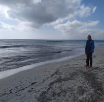 nekoliko zapuščenem parkirišču (5€). Na plaži poleživa na soncu. Piha, zato se
