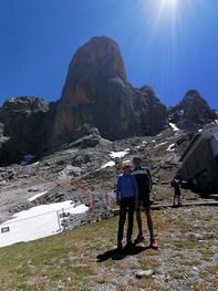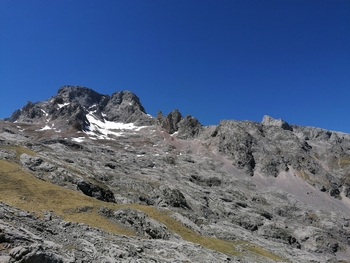Soteska se zoži in postane strmejša, kmalu prideva do varoval. Spet se strmo vzpenjava. Prehitevajo naju gorski tekači. Hodiva proti zelo strmemu in z meliščem in gramozom pokritem kanalu Camburero . Sopiham po strmem klancu končno pridem do široke travnate ploščadi, kjer me čaka Miro in pomalicava. Tu so ruševine koče Camburero. Po travnatem pobočju se vzpneva do, meni, najtežjega dela poti. Strm vzpon po grobem melišču je dolg vsaj kak kilometer. Nadaljujem proti dolgemu, ozkemu skalnem kanalu. Končno vidim vrh Picu Urriellu ali El Naranjo de Bulnes. Z višino 2519 metrov je eden od najbolj prepoznavnih vrhov Picosov, posebej zaradi 550 višinskih metrov zahodne stene, ki se sveti v oranžnih tonih. Prečkati morava še kotanjo, polno snega , na drugi strani preplezati steno. Prečkava kratko melišče in končno sva na široki planoti Urriellu na 1960m ob vznožju znamenitega vrha. Pomalicava, si spočijeva in po drugi strani pobočja, kjer je pot lažja, cikcakava proti dolini. Prečkava pobočje , sledi spust do koče Teremosa. Spustiva se po širokem travniku, kjer se pase velika čreda goveda proti raztresenim kočam Majada Jelguera. Od tu naprej prideva na zelo slabo stezo, polno izvirkov, blata, vse do Bulnesa. Za 15km poti sva porabila 6,5h in naredila 1400vm. Z železnico se spustiva v Poncebas in na zasluženo pivo.....