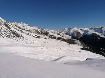 manj snega (deloma spihan), od sedla naprej pa je smuka odlična, ~20 cm pršiča.