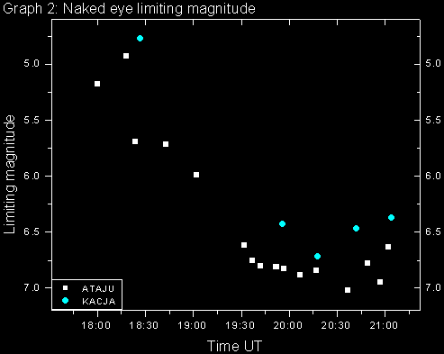 Apart from photographing the eclipse we also did two visual projects: estimating the magnitude of the eclipsed Moon with reversed binoculars and christmas globe and estimating the limiting sky magnitude during the eclipse. The Moon magnitude is represented on graph 1, the lowest value was achieved during mid-eclipse with the magnitude estimated between -1.3 and -1.4. The naked eye limiting magnitude was between 6.5 and 7.0 during mid-eclipse, the difference caused by a difference in perception of both observers.
