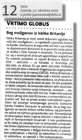 Pozorno preberi besedilo in odgovori na vprašanja! Kdaj in kje je bil časopisni prispevek objavljen? Kateri časnik je članek objavil v originalu? Kaj pomeni izraz "beg možganov"? Zakaj "možgani" bežijo? Kakšne probleme ustvarja "beg možganov"? Koliko britanskih "možganov je pribežalo" v Avstralijo?