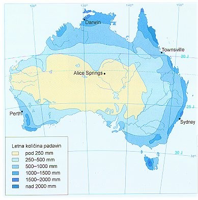 Suho podnebje - dve tretjini Avstralije pesti pomanjkanje padavin; tretjina dobi celo manj kot 250mm padavin letno.