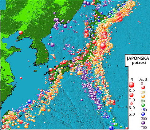 Potresi na Japonskem - globina in jakost potresov