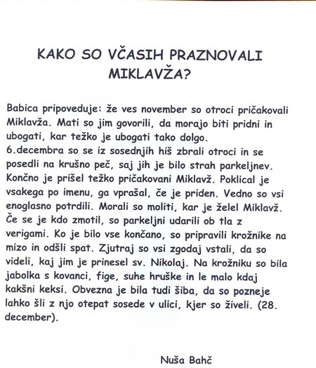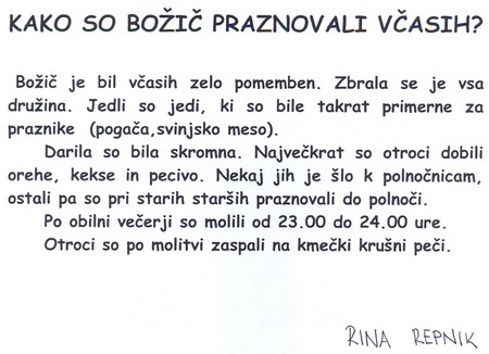 V recitatorsko-novinarskem krožku smo zbirali podatke o praznovanju praznikov nekoč. Najprej smo se v krožku pogovorili, kako danes praznujemo praznike, kateri so jim najljubši in zakaj. Nato so doma povprašali stare starše in starše, kako so včasih praznovali praznike. Te izkušnje so člani krožka prenesli med nas, nam o tem pripovedovali, ob tem pa je nastalo tudi nekaj zapisov o praznovanjih. Vsekakor zanimiva izkušnja, saj lahko tudi tako vstopajo v svet ljudi, ki jih imajo radi in se soočijo z drugačnim načinom življenja.