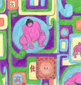risbe sumo borcev, katerih dohyo (ring) postane prav tapetni vzorec.