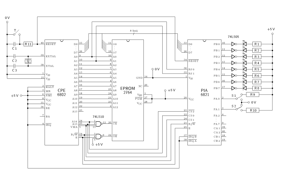 NAND vrati na vezju TTL 74LS10, kvarčnim kristalom 4 MHz, reset tipko, 2 stikali (kot vhodom) ter 8 LED-diodami (kot izhodom).