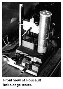 Foucault je uspešno naredil odbojne teleskope premera 10 in 20 cm, toda za večje premere so takratne metode poliranja optične podlage postale neprimerne. Po petih neuspelih poskusih pri izdelavi 42-centimetrskega ogledala je Foucault razvil tri tehnike za preizkušnjo optične podlage. Najmočnejši je bil test z noževo konico. Ostro nabrušeno rezilo je odbilo podobo točke izvora tako, način, da se kakršnakoli napaka pri poliranju pokaže v pretiranem reliefu. S tem omogoča optiku, da prepozna in odstrani nepravilnosti.
