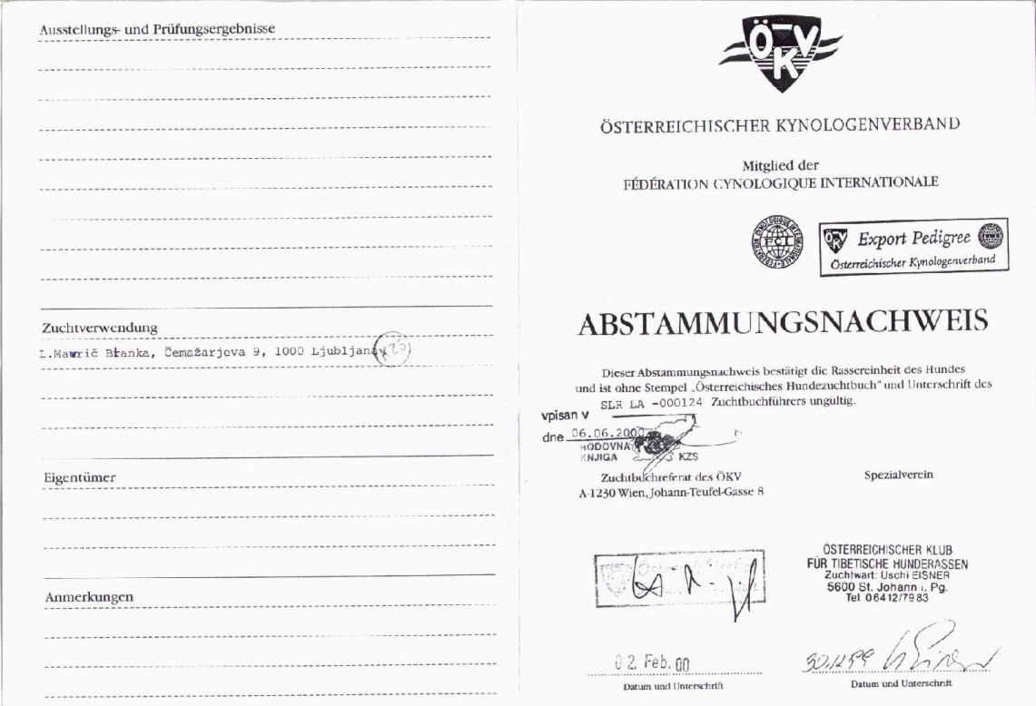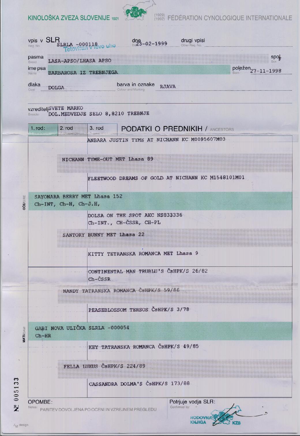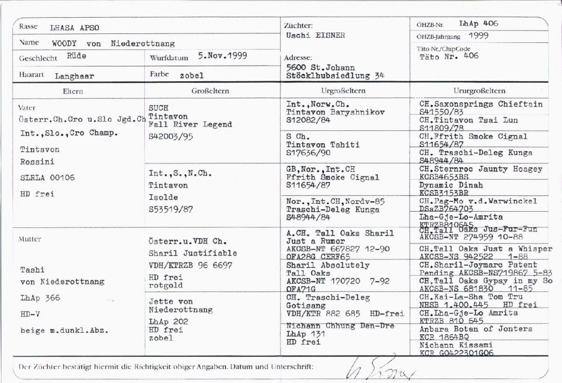 Woodyjev rodovnik (prva stran, stran s predniki) (ata mladičev leta 2002)