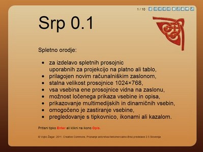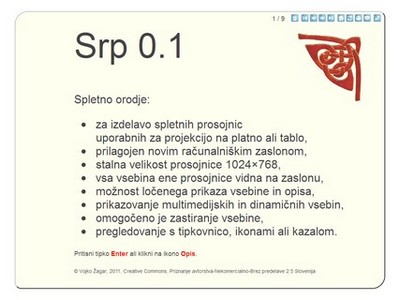 Z orodjem je možno izdelati spletne prosojnice, namenjene učiteljem za kratko podporo pri pouku. Vsebina je podana v preprosti obliki, za motivacijo na začetku ure ali pa za podporo v razlagi učne vsebine. Običajno je podana z multimedijskimi (slike, zvoki, filmi) in dinamičnimi (javanske konstrukcije, svg in html5 animacije) gradniki. Besedila je običajno malo, če že potem so to oporne točke. Podrobnejši besedilni opis, ki dopolnjuje vsebino, se po potrebi pripravi v posebnem opisu. Ta se prikaže s pritiskom na tipko Enter ali pa z klikom na ikono Opis.