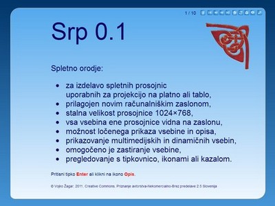 Srp je spletno orodje, kar pomeni, da se nove prosojnice izdelujejo z zagonom orodja v spletnem brskalniku Firefox (4. ali več). Orodje mora biti nameščeno na spletnem strežniku. Delovanje je preverjeno na dveh vrstah strežnikov: lokalnem strežniku XAMPP in Arnesovem virtualnem strežniku.