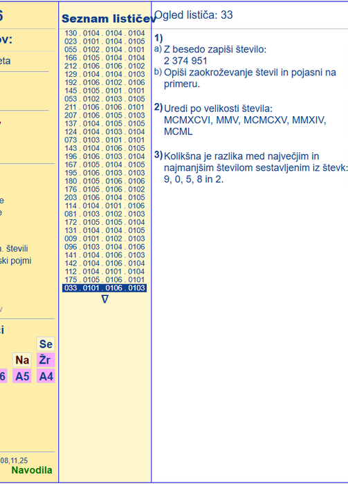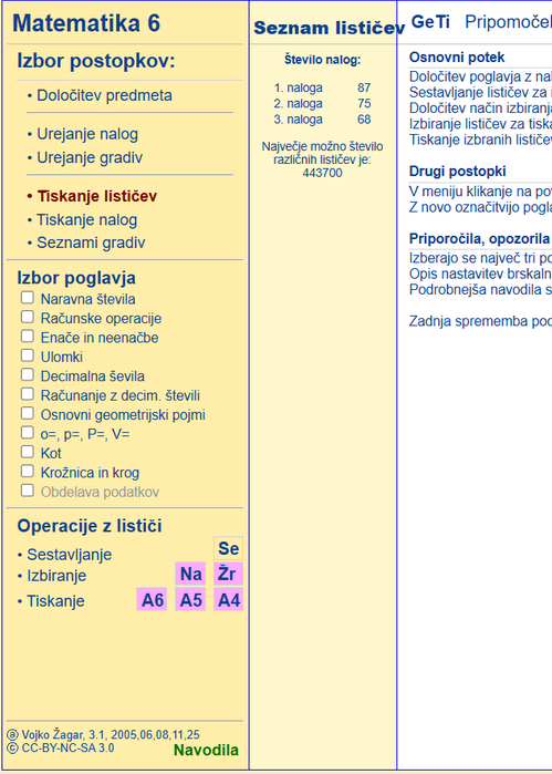 | Tiskanje lističev Spletna stran za pripravo lističev, izbiranje, žrebanje in tiskanje. Izbiranje poglavij in priprava lističev Lističi se pripravijo in natisnejo za vsako ustno ocenjevanje. Stari (lanski) lističi se običajno ne uporabljajo saj so naloge lahko preurejene. V seznamu poglavij pod menijem operacij na levi strani zaslona se označijo tista poglavja, katerih učna vsebina se ocenjuje. Označeno mora biti vsaj eno poglavje. Priporočena je izdelava lističev za ocenjevanje iz vsaj dveh poglavij in ne več kot treh. | ![]() |
