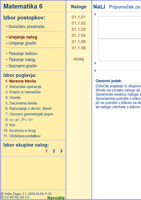 | Upravljanje nalog Spletna stran za dodajanje, spreminjanje in popravljanje nalog za ustno ocenjevanje znanja izbranega predmeta. Urejanje je mogoče, ko je predmet odprt/izbran in so zanj urejena poglavja. Pod menijem je prikazan seznam poglavij, pod njim pa gumbi posameznih skupin nalog. Določitev poglavja in skupine Naloge so zbrane v poglavja, znotraj poglavja pa še v skupine. Skupina predstavlja zahtevnostno raven ali tematski sklop. Število skupin je lahko največ tri. Naloga je lahko zastavljena iz enega samega vprašanja, lahko je sestavljena samo iz podvprašanj (do šest), lahko pa v obliki splošnega opisa/vprašanja in podvprašanj. Dodajanje nove naloge Dodanje nalog se sproži s klikom na oznako Urejanje vsebine naloge V srednjem stolpcu se prikaže seznam že pripravljenih nalog izbranega poglavja in skupine. Naloge so označene z dvomestno številko poglavja, z oznako skupine in dvomestno zaporedno številko naloge v poglavju/skupini. Oznake so ločene s piko. Izbor naloge (klik) prikaže na desni se vsebino naloge. V spodnjem delu je naloga prikazana v celoti, z dodatnim opisom vred, v zgornjih dveh oknih pa le osnovi del naloge in podnaloga a) v kodiranem zapisu. V teh dveh okinih se ureja vsebina naloge. Brisanje naloge Označitev naloge v seznamu drugega stolpca. Klik na ikono | ![]() |