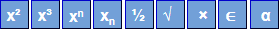 x² x³ Kvadrat in kub, spremenljivke ali izraza. Izraz x2 je v besedilu podan v obliki x!2. xn xn Poljubna potenca in indeksirani izraz. Izraz Xi je v besedilu podan v obliki X!i{i}. Izraz ex, pa v obliki e!p{x}. √ Kvadratni koren kot oznaka za realno število √2 ( !r{2} ), ali matematični izraz s korenjenjem √(64+36) ( !r{(64+36)} ). Pod korenom je lahko celo ulomek √25/64 ( !r{!u{25,64}} ), ali koren √ √16 = 2 ( !r{!r{16}} = 2 ). ½ Ulomki so prikazani v navadni obliki, ko je ulomkova črta poševnica. Ulomek ¾ je v besedilo vključen z izrazom !u{3,4}. Ta zapis se uporablja tudi za izraze zapisane z ulomkovo črto (x-1/x+1). × Matematični operatorji za osnovne in razširjene operacije. Pojavi se pogovorno okno z naborom šestnajst operatorjev. Operator se vključi v besedilo s klikom na ustrezno celico. ∈ Operatorji in oznake iz teorije množic in geometrije. Uporabijo se na enak način kot matematični operatorji. α Najpogostejše male in velike črke grške abecede. Uporabijo se na enak način kot matematični operatorji. Druge grške črke se vključijo v besedilo na podoben način kot črka dzeta: mala ζ (&'zeta;) in velika Ζ (&'Zeta;).