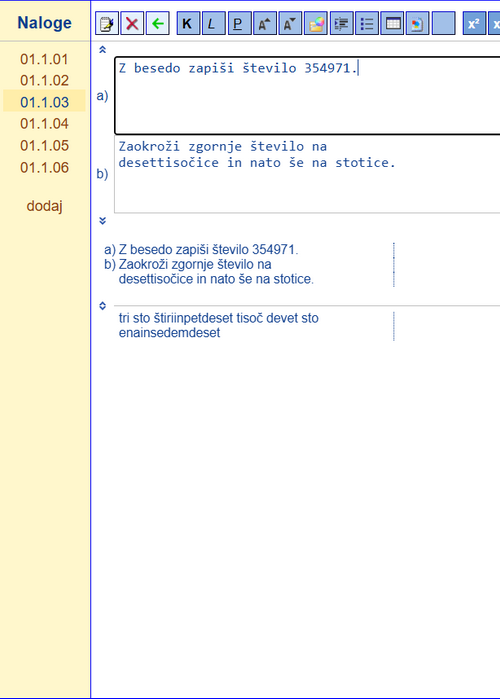 | Oblikovanje nalog Pri urejanju besedila naloge je najboljše, da se besedilo najprej vnese, potem pa oblikuje. Deli besedila, ki jih je treba preoblikovati se označijo, nato v orodni vrstici pritisne ustrezni gumb za oblikovanje. | Vstavljanje gradnikov Oblikovni in vsebinski gradniki se vstavijo v besedilo na mesto kazalca. Pojavi se pogovorno okno, v katerem se izbere gradnik. Ta se vstavi po kliku na gradnik ali pa kliku na ikono za vstavljanje.